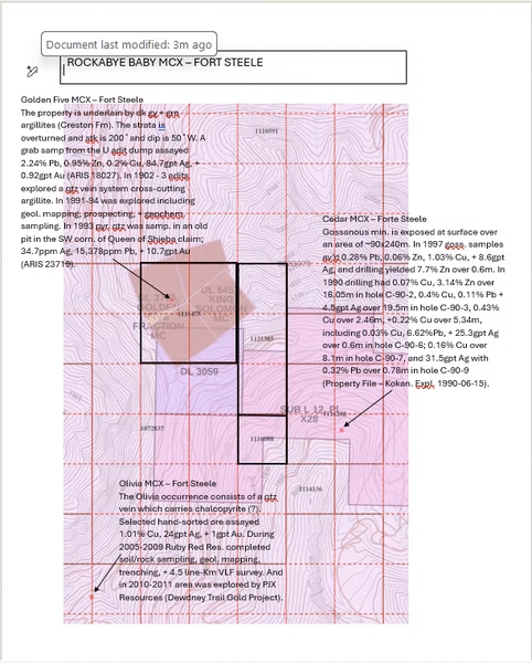Is a superior mineral claim with 4 reverted Crown Grants. As the map shows there are 4 cells Tenure 1111475. GTD 2030/Feb/28, and 3 cells Tenure 1121385) GTD 2026/Mar/04. There is very good access to these claims but the road has embedded cobblestones and is quite a bumby road. The Golden Five Minfile has reported assays from a Upper adit 2.24% Pb, 0.95% Zn, 0.2% Cu, 84.7gpt Ag, + 0.92gpt Au (ARIS 18027). In 1993 pyritic quartz was sampled in an old pit in the SW corner of the Queen of Shieba claim which had 34.7ppm Ag, 15,378ppm Pb, and 10.7 gpt Au (ARIS 23719). In 2023 this author worked on the claim tenure 1111475 for 3 days (ARIS 42591) and the claim has been extended to 2030/Feb/28.